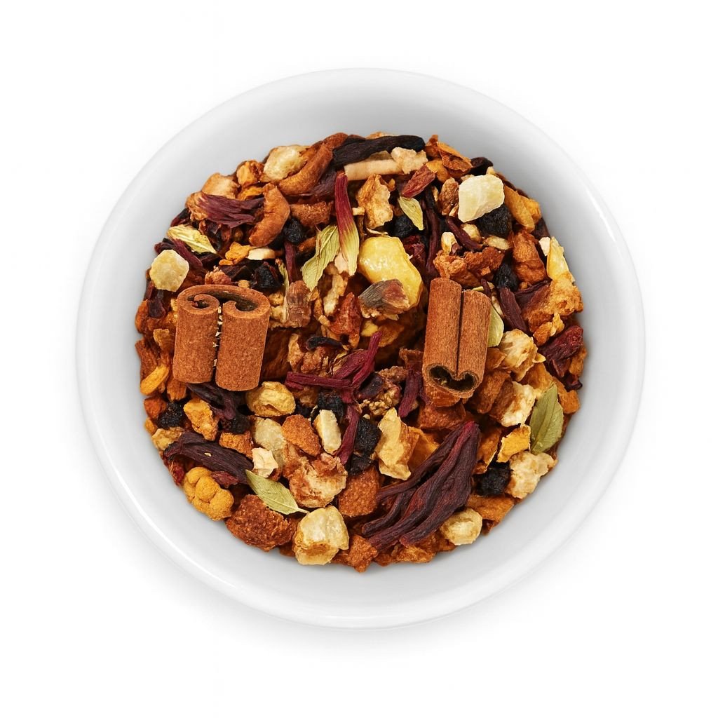 Son mélange naturellement sans thé, associant pomme, ananas, sureau et cannelle, offre une infusion gourmande, fruitée et délicatement épicée.